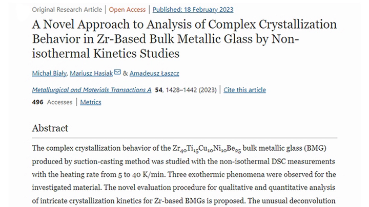 We are pleased to announce that Michał Biały, Mariusz Hasiak, and Amadeusz Łaszcz, researchers from the Multifunctional Amorphous and Crystalline Materials Laboratory, have published a new article in the prestigious academic journal Metallurgical and Materials Transactions A.
